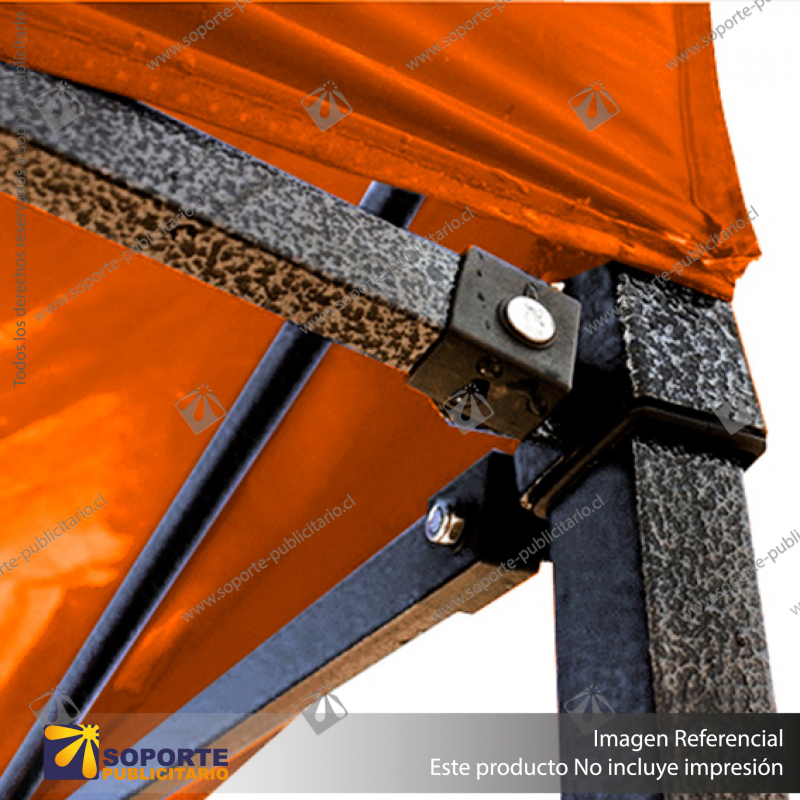 Las carpas 2*2 mts color naranjo para toldos publicitarios están fabricadas en poliéster impermeable de alta calidad con filtro UV, lo que genera entornos protegidos con la posibilidad de agregar mensajes corporativos en sus caras y cenefas. Las carpas incorporan unos velcros industriales en cada esquina para fijar con seguridad la lona a la estructura para toldos publicitarios.