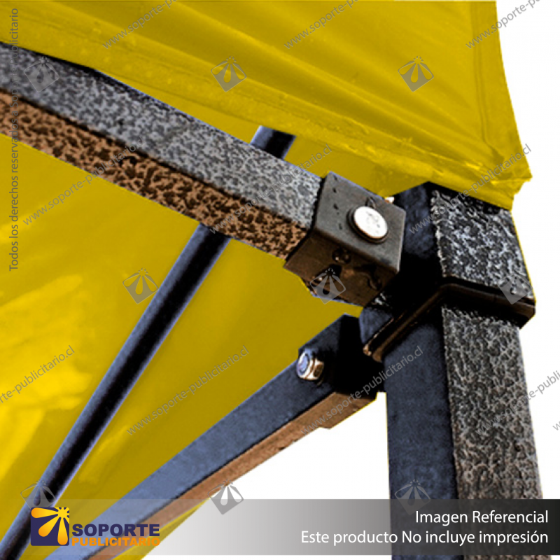 Las carpas 3*4.5 mts color amarillo para toldos publicitarios están fabricadas en poliéster impermeable de alta calidad con filtro UV, lo que genera entornos protegidos con la posibilidad de agregar mensajes corporativos en sus caras y cenefas. Las carpas incorporan unos velcros industriales en cada esquina para fijar con seguridad la lona a la estructura para toldos publicitarios.