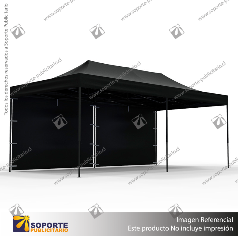 Las carpas 3*6 mts color negro para toldos publicitarios están fabricadas en poliéster impermeable de alta calidad con filtro UV, lo que genera entornos protegidos con la posibilidad de agregar mensajes corporativos en sus caras y cenefas. Las carpas incorporan unos velcros industriales en cada esquina para fijar con seguridad la lona a la estructura para toldos publicitarios.