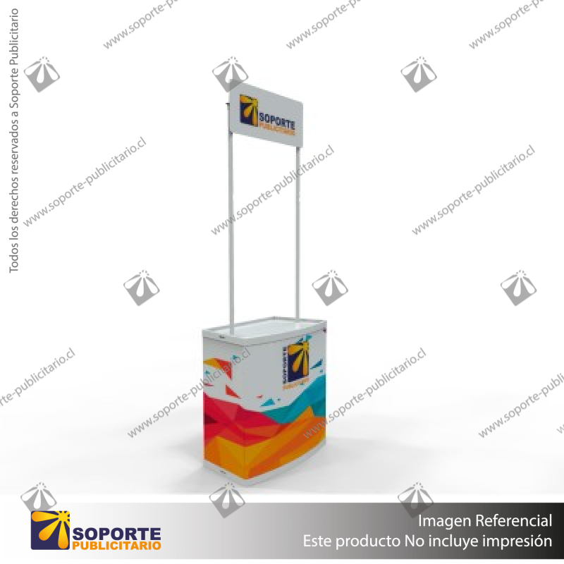 El counter básico se caracteriza por crear un entorno de atención al cliente con 2 zonas para el desarrollo de gráficas, liviano para su transporte y de fácil armado. El counter publicitario se compone de 5 partes (cubiertas, cuerpo, pilares, cenefa y bolso).