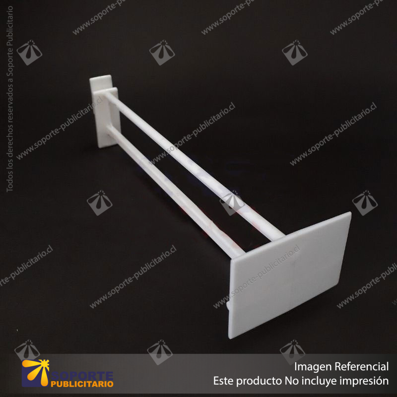 Ganchera doble, la vara en la parte superior posee un porta precio y la inferior está destinada para exhibir productos. Elaborada material plástico ABS blanco.