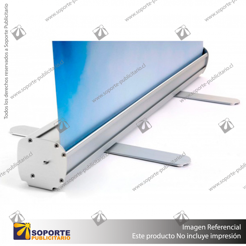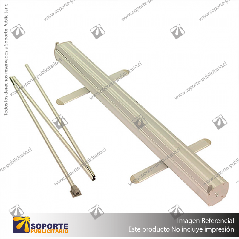La base de los pendones roller 200*200cms es su componente principal, esta posee un sistema de autoenrollado lo que permite que la gráfica sea guardada de forma fácil, rápida y segura evitando rallas, pliegues y cortes en el bodegaje o transporte. Este componente del pendón roller de 200*200cms posee 3 soportes inferiores que se giran para otorgar estabilidad a la gráfica en su uso. Se recomienda posicionar la base sobre una superficie lisa y sin inclinación.