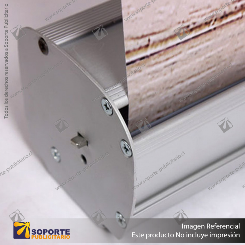 La base de los pendones roller 300*200cms es su componente principal, esta posee un sistema de autoenrollado lo que permite que la gráfica sea guardada de forma fácil, rápida y segura evitando rallas, pliegues y cortes en el bodegaje o transporte. Este componente del pendón roller de 300*200cms posee 4 soportes inferiores que se giran para otorgar estabilidad a la gráfica en su uso. Se recomienda posicionar la base sobre una superficie lisa y sin inclinación.