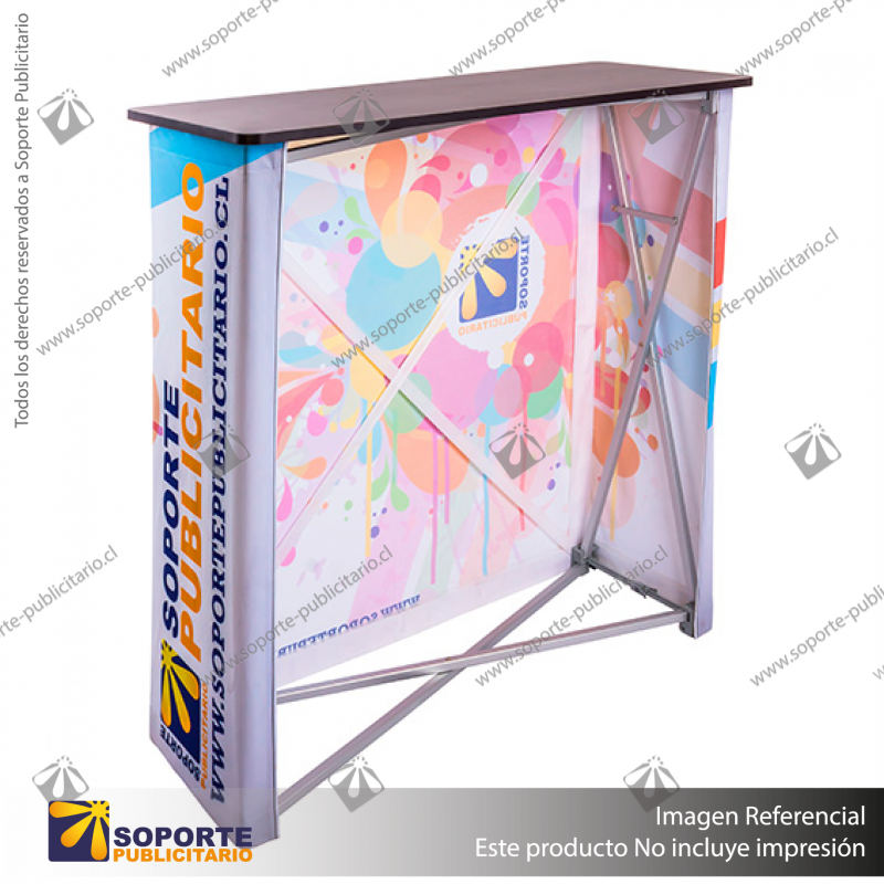 COUNTER PUBLICITARIO TEXTIL SUPERIOREl Counter Textil Superior se caracteriza por apoyar la atención al cliente, es transportable y de fÔcil armado, esta estructura es plegable quedando muy compacta para transportar. La mesa promocional se compone de 5 partes (estructura plegable, cubierta de madera, bandejas, velcro y bolso). |